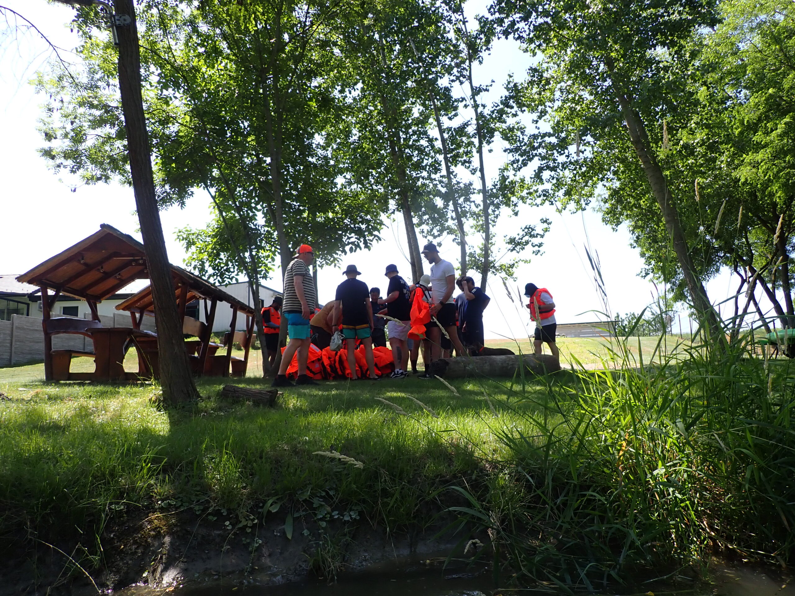 Kiosztjuk a felszerelést (evezőlapátokat, mellényeket, vízhatlan zsákokat)